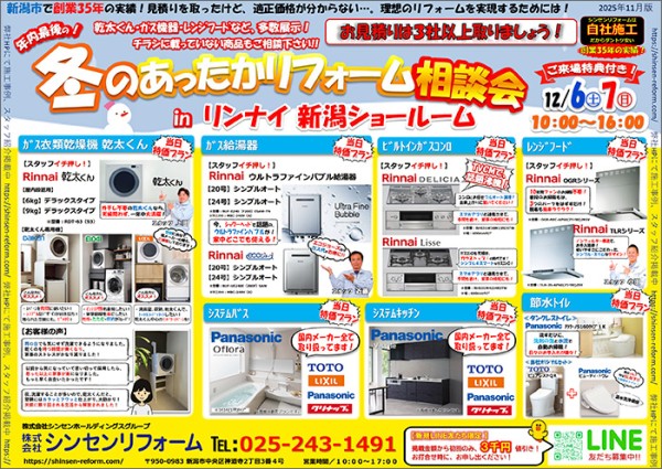 『冬のあったかリフォーム相談会 in リンナイ新潟ショールーム』開催のお知らせです。